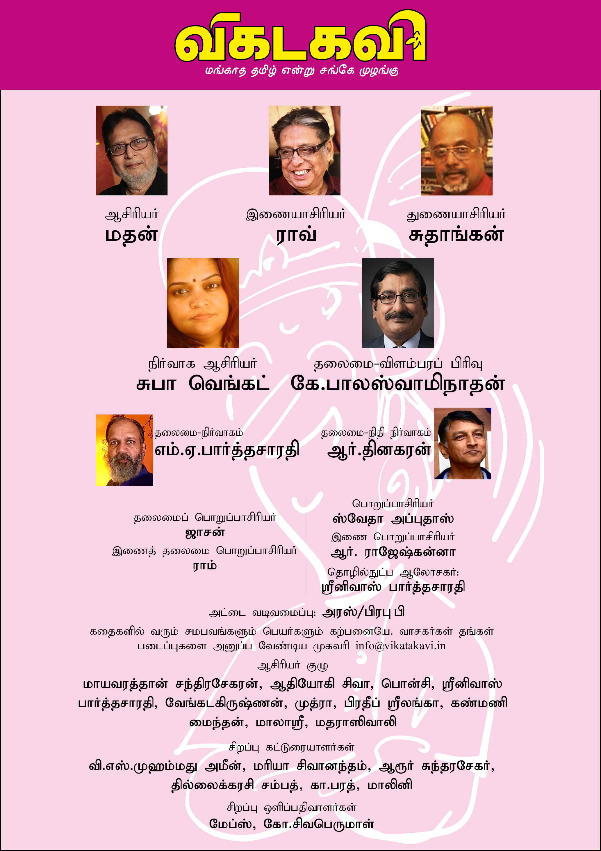 கதைகளில் வரும் சமபவங்களும் பெயர்களும் கற்பனையே. வாசகர்கள் தங்கள் படைப்புகளை அனுப்ப வேண்டிய முகவரி info@vikatakavi.in